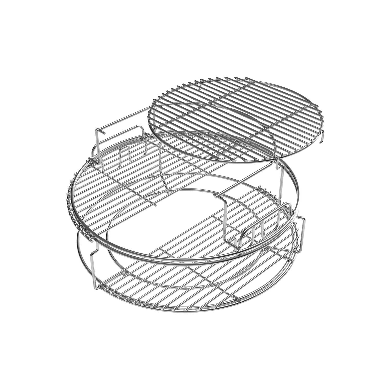 The Eggspander is a multi-level cooking system that expands the grilling capabilities of the Big Green Egg, allowing users to cook on multiple levels simultaneously, use different cooking techniques, and increase the overall grilling surface. It typically includes components like a multi-tier rack, half-moon grids, and sometimes a convEGGtor basket.